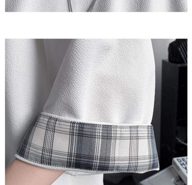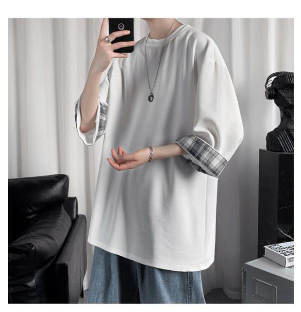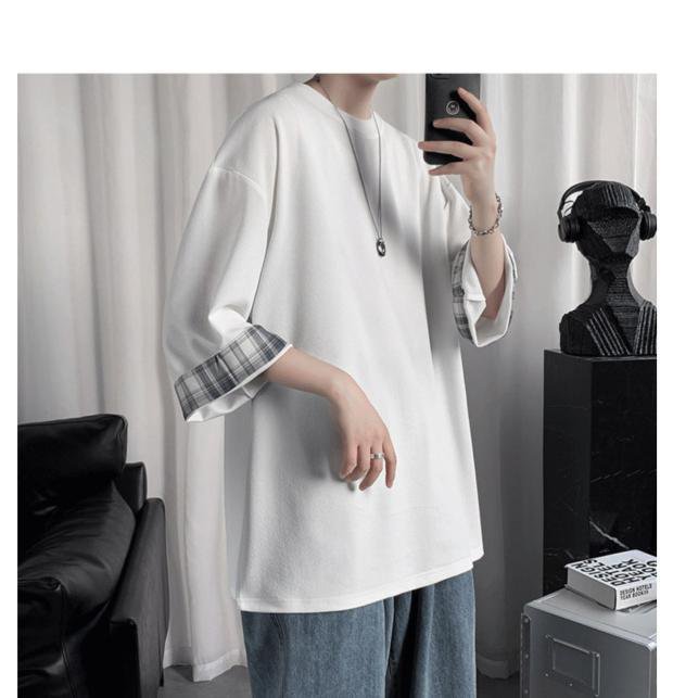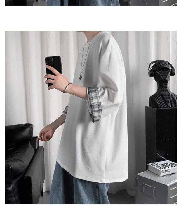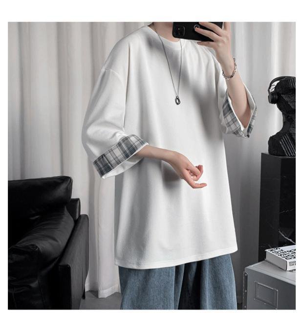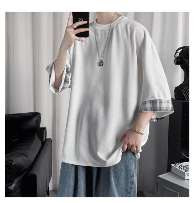 ビッグサイズルーズサマーメンズ半袖Tシャツ ラウンドネックTシャツ 学生チェック柄トップス